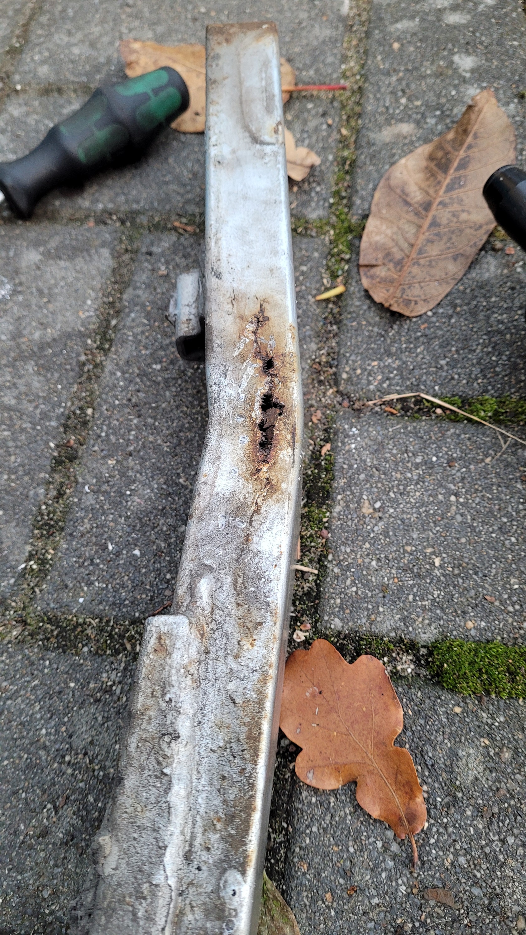 Letzten November aus Berlin geholt, sollte einen "Herzfehler" haben. Ursprünglich wollte ich nur meinen Reservemotor reinhängen und dann ab dafür. Hab mich dann aber doch entschlossen, das Ding auseinanderzureißen und neu aufzubauen. Dabei habe ich u.a. diesen Befund an der Schwinge entdeckt...